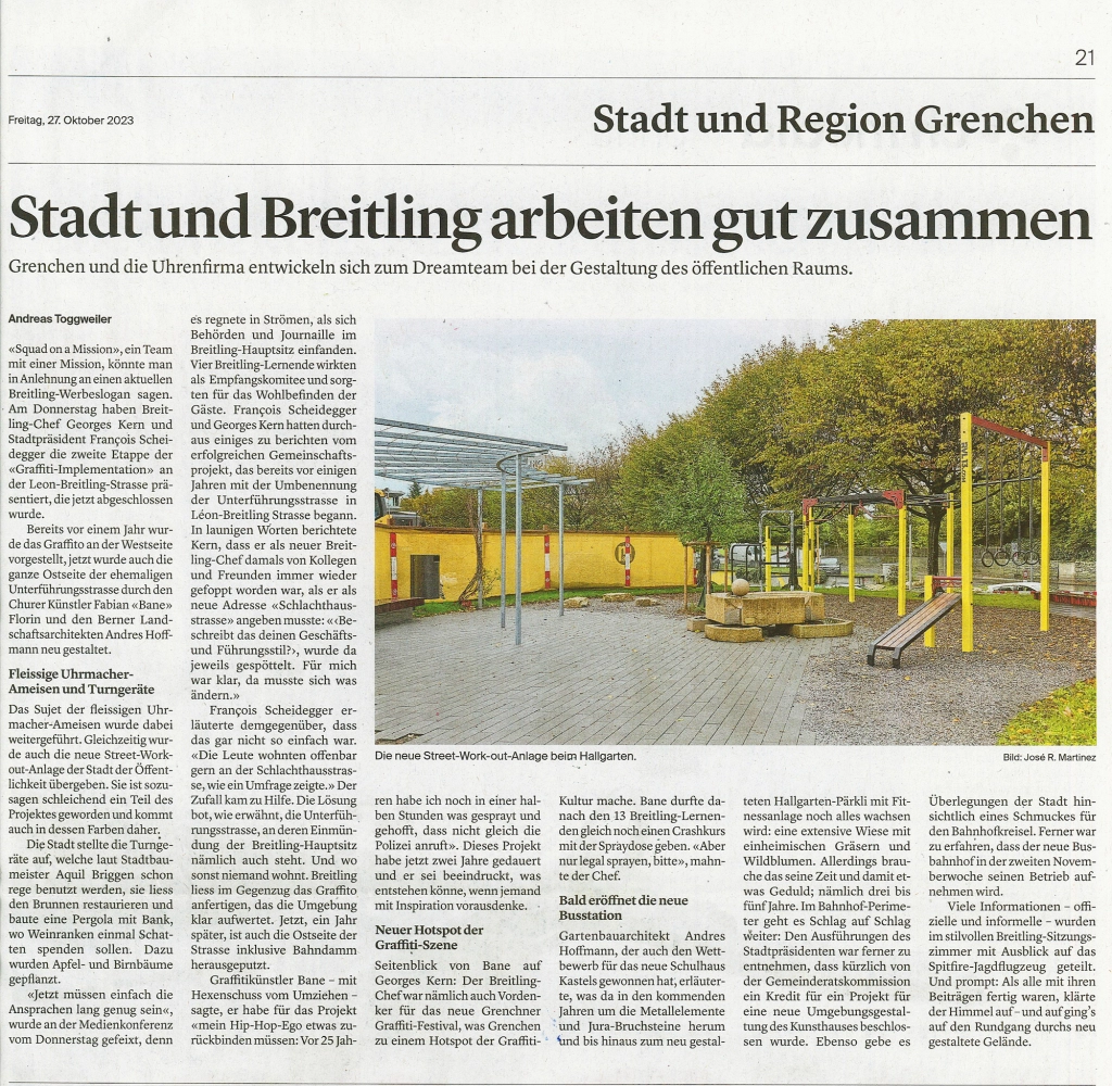 Breitling Grenchen - Kunstprojekt als Aufwertung des Strassenraumes Zusammen mit dem schweizer Streetart-Künstler BANE durften wir für die alteingesessene Uhrenfirma die Strasse vor dem Hauptsitz in Grenchen aufwerten und neu gestalten. Im selben Zuge wurde der Hallgarten saniert und mit einer attraktiven Streetworkout-Anlage ausgestattet. Mehr anzeigen